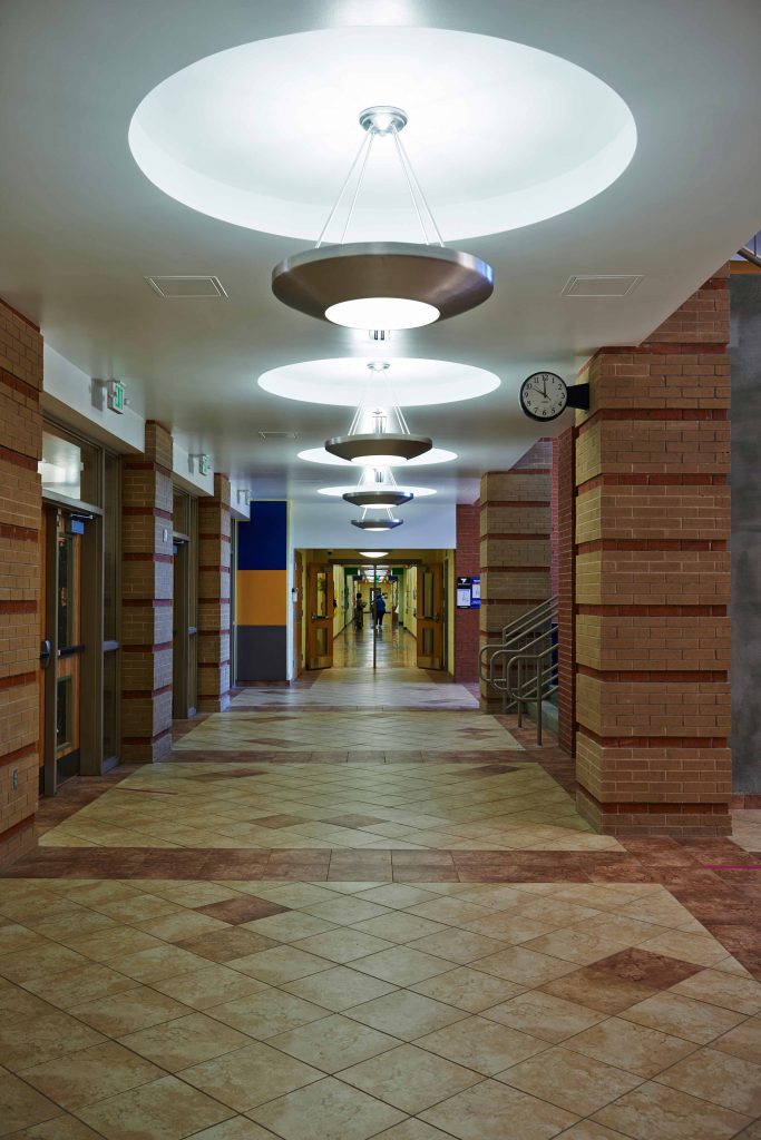 “We were mindful that the school was being placed in a residential area,” he says.“We blended the design of the school into and complemented the neighborhood. The building floor elevation was set lower than the the former school that was demolished, so that the two story spaces and the high volume spaces would not over power and dominate the residential area.”